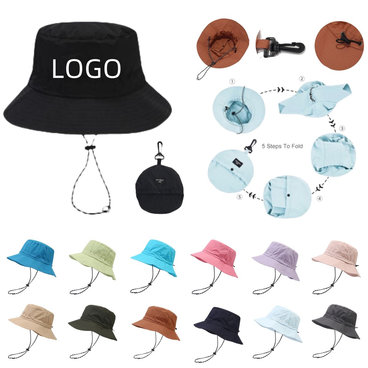 This is a fisherman's hat made of polyester, quick dry, waterproof fabric that does not fear rain, protects the face and neck from harmful rays, adjustable and detachable chin strap, rear adjustable elastic drawstring design, a size suitable for most adult head circumference, casual style for both sexes, the hat can be folded into a small bag for easy storage, hook design can be hung on your backpack, travel and play a good companion.