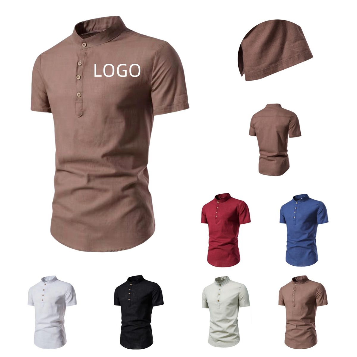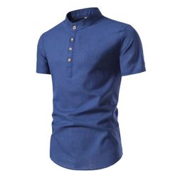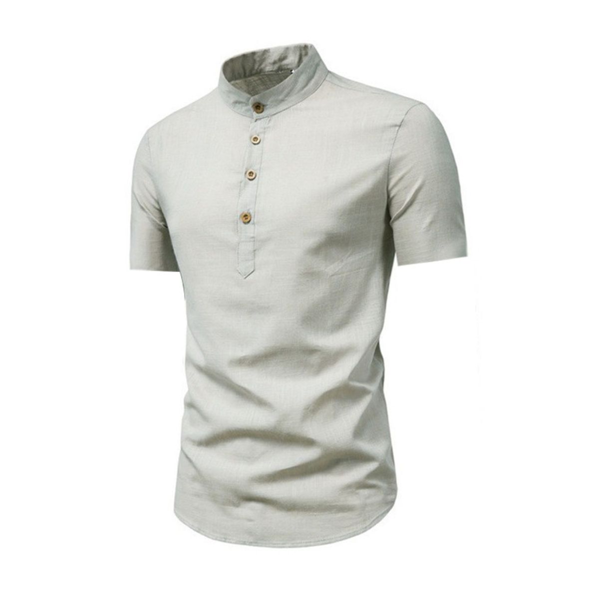 This is a men's short sleeved shirt, can be washed by cold water machine or hand, low temperature ironing, natural cotton and linen blend fabric, moisture absorption and sweat, light and breathable, suitable for summer and warm weather use, simple classic style short-sleeved shirt, standing collar design makes you look more handsome and elegant, 4 horn buttons add luxury retro feeling to the clothes, suitable for daily, work, travel, beach, wedding Wait.